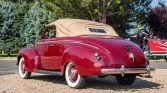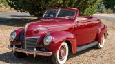 This 1939 Mercury Eight convertible is finished in maroon over tan vinyl and powered by a 239ci flathead V8 paired with a three-speed manual transmission with electric overdrive. The car was reportedly refurbished under prior ownership and was acquired by the seller in 2019. Details include a tan Haartz cloth top with a glass rear window, a two-piece windshield, running boards, 15″ body-colored steel wheels, and a heater.
