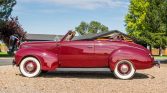 The car rides on a 116″ wheelbase and is finished in maroon with tan pinstripes and polished moldings on the sides. Equipment includes a tan Haartz cloth top with glass rear window, a two-piece windshield with a center mounted antenna, running boards, windshield wipers, and chrome bumpers. A body-colored top boot accompanies the vehicle.
