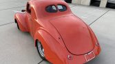 This Willys coupe street rod was built by Fulk’s Rod Shop of Sandyville, West Virginia, utilizing a boxed tube frame and a 1940 Willys Americar-style steel-reinforced fiberglass body. The car is finished in orange over tan leather upholstery and is powered by a 502ci GM V8 paired with a three-speed automatic transmission. Equipment includes Vintage Air air conditioning, VDO instrumentation, a tilting Ididit steering column, a Sony CD stereo, Billet Specialties wheels, and disc brakes.