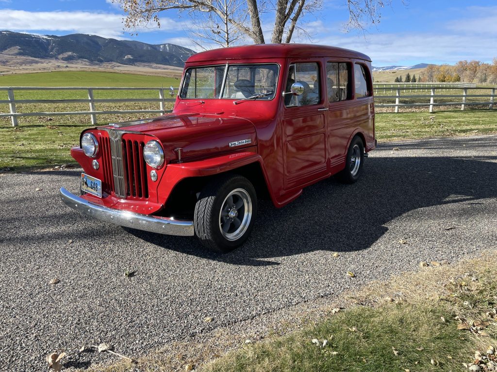 This 1947 Willys-Overland station wagon was refurbished and modified during prior ownership, which included repainting the exterior red, fitting bucket seats with two-tone upholstery, and installation of a 318ci V8 paired with a three-speed automatic transmission. Further additions include Edelbrock engine components, an aluminum radiator, a dual exhaust system with Flowmaster mufflers, lowered suspension, American Racing wheels, an aftermarket shifter, and a Kenwood stereo.