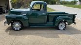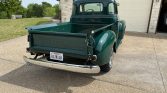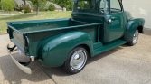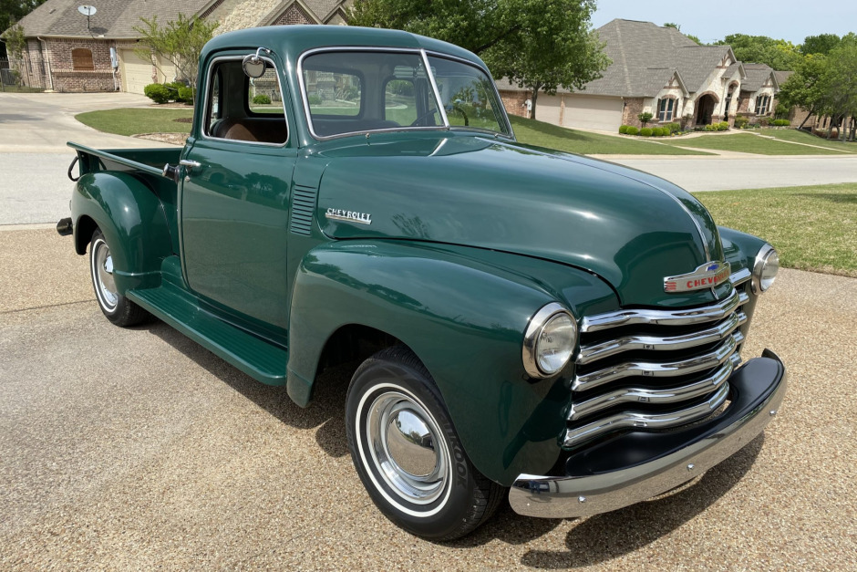 This 1949 Chevrolet 3100 is a five-window half-ton pickup that is finished in green over tan vinyl and powered by a replacement 235ci inline-six paired with a four-speed manual transmission. Features include dual side mirrors, a wooden bed floor, and a floor-mounted shifter.