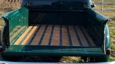 The truck was repainted in green under prior ownership and features a chrome front grille and bumpers and bright trim on the headlight surrounds, windows, and split windshield. Additional exterior details include an engine air vent, dual side mirrors, and wooden bed slats.