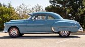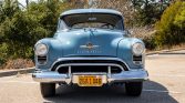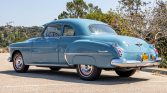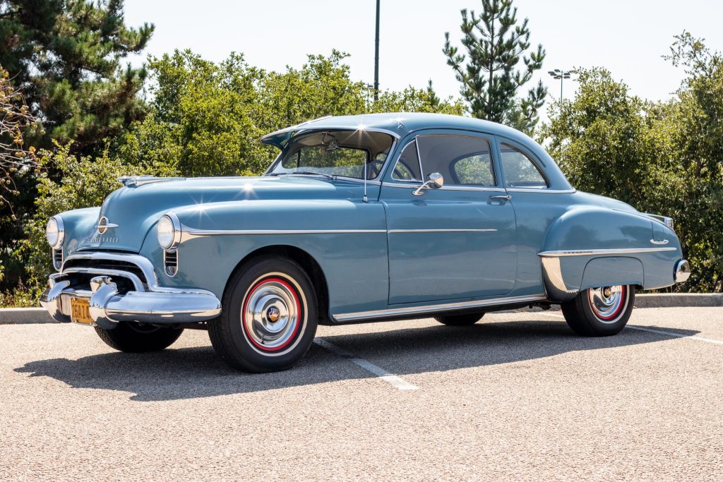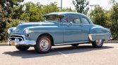 This 1950 Oldsmobile Rocket 88 club coupe is finished in blue over blue upholstery and is powered by a refurbished 324ci V8 from a 1955 Oldsmobile mated to a factory-optioned Cadillac-LaSalle three-speed manual transmission. The car spent time in Southern California and was repainted under previous ownership before the seller’s acquisition in 2016. Under current ownership, the factory 303ci V8 was replaced, a new exhaust system was installed, and the electrical system was converted to 12 volts.