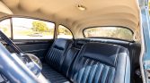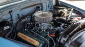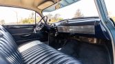 The cabin features seating upholstered in blue vinyl accompanied by a matching dashboard, door panels, and carpeting. Chrome accents the door panels and dash, and additional amenities include a center arm rest in the front bench seat, a heater, a dash-mounted clock, a locking glovebox, and an AM radio.
