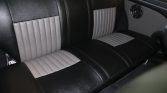 The cabin features Cadillac-sourced front bucket seats trimmed in black leather with gray inserts, and the rear bench seat and door panels are upholstered to match. The custom center console houses a JVC media unit with an integrated rear-view camera, and further additions include a three-spoke steering wheel, a Vintage Air climate-control system, and power-operated functions for the driver’s seat and side windows.