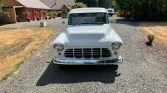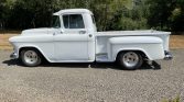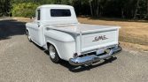 This 1957 GMC 100 pickup is finished in white over white and powered by a 350ci V8 mated to a three-speed automatic transmission. Features include oak bed slats, power-assisted front disc brakes, power steering, 15″ Prime alloy wheels, pinstriping, a chrome grille, trim, and bumpers, custom bucket seats, Classic Instruments gauges, a Blaupunkt AM/FM cassette stereo, an Edelbrock Performer intake manifold, HEI electronic ignition, a custom dual exhaust system, and a finned aluminum air cleaner and valve…