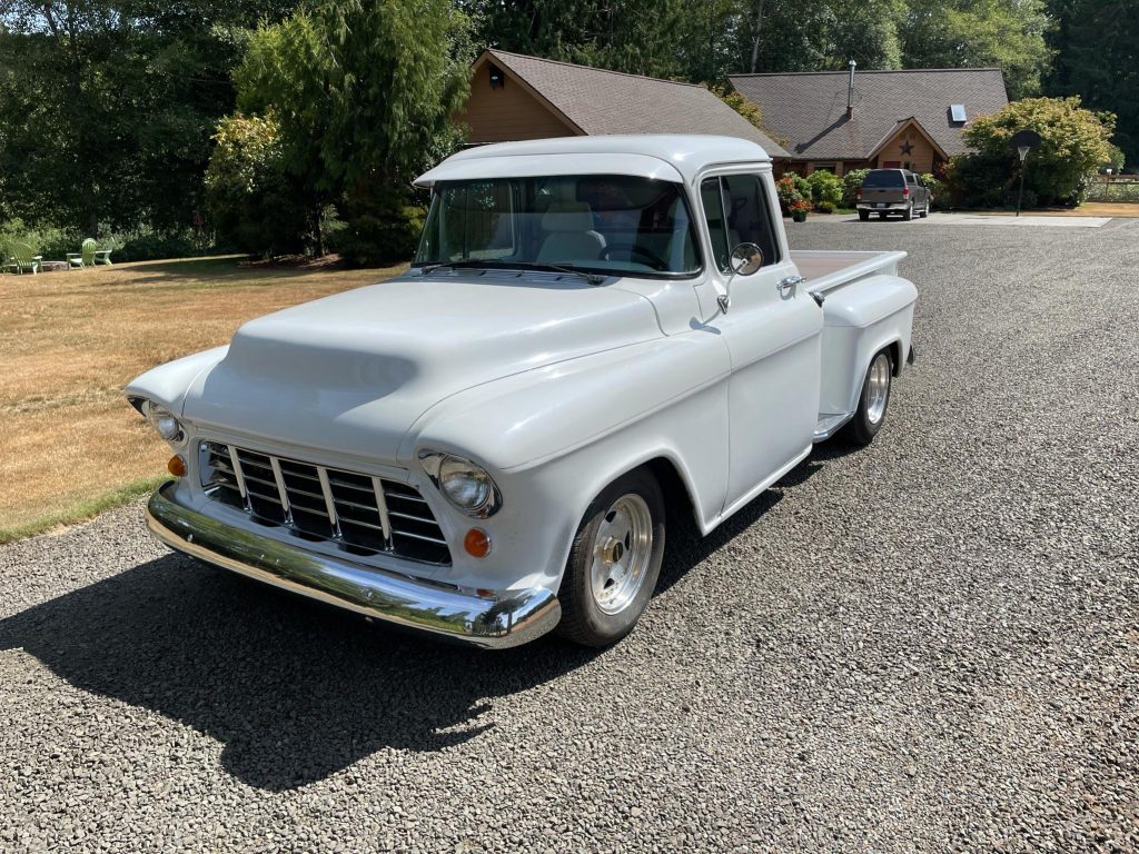 This 1957 GMC 100 pickup is finished in white over white and powered by a 350ci V8 mated to a three-speed automatic transmission. Features include oak bed slats, power-assisted front disc brakes, power steering, 15″ Prime alloy wheels, pinstriping, a chrome grille, trim, and bumpers, custom bucket seats, Classic Instruments gauges, a Blaupunkt AM/FM cassette stereo, an Edelbrock Performer intake manifold, HEI electronic ignition, a custom dual exhaust system, and a finned aluminum air cleaner and valve covers.