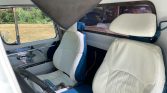 The cabin features seating upholstered in white leather with blue seat trim and a center console. Equipment includes a body-colored dash and door panels with chrome accents, air conditioning, blue carpets, seatbelts, aftermarket speakers, a Blaupunkt AM/FM cassette stereo, and a tilt steering column.