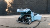 The car is finished in light blue and features a black roll bar, front bumper overriders, rear bumperettes, and a blue personalized California license…