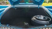 The cabin features front and rear bench seats trimmed in blue vinyl with patterned black and blue cloth inserts along with blue door panels and carpeting. Equipment includes a six-way electrically adjustable front seat, front lap belts, power windows, a clock, and a rear armrest. A Pioneer remote-control stereo is located beneath the front bench.