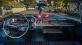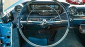Delivered from the factory in Georgian Blue with a Dover White top (24-12), the pillarless hardtop body is said to have been repainted in the 1990s. Equipment includes chrome bumpers and trim, fender skirts, a single-row rear grille, upright fins, and dual-bullet-style taillights.