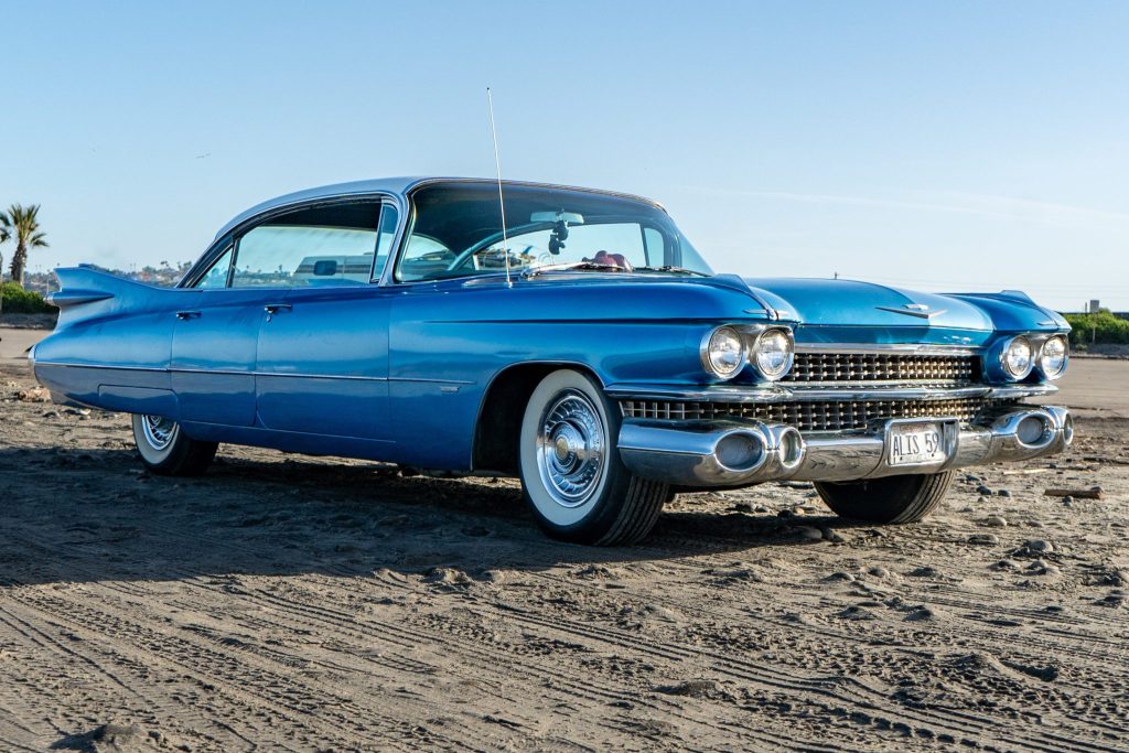 The steel wheels wear Cadillac Motor Division hubcaps, and they are mounted with L76–15 bias-ply whitewall tires. The Series 62 rode on a 130″ wheelbase for 1959 and featured an independent front suspension and a live rear axle with coil springs at all four corners. Power-assisted steering and four-wheel drum brakes were standard equipment.