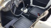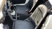 The cockpit features bucket seats upholstered in black vinyl with white piping as well as matching door trim and carpets. Equipment includes lap belts for both occupants, a chrome passenger grab handle, storage pockets in the doors, and a Blaupunkt cassette stereo.