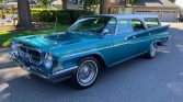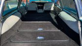 Originally finished in white, the car is said to have been repainted in teal blue and white during a refurbishment under current ownership. Features include angled quad headlamps, chrome bumpers, finned quarter panels, a rear tailgate with power window, a fender-mounted mirror, reverse lamps, and dual-outlet exhaust.