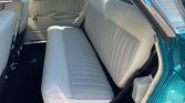 The cabin features three rows of bench seating reupholstered in parchment leather with pleated inserts along with matching door trim panels. The car features a black dash covering and carpet, push-button transmission gear selector, remote mirror control, a rear-facing bench seat that stows in the floor, and an analog clock.