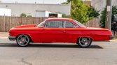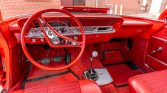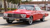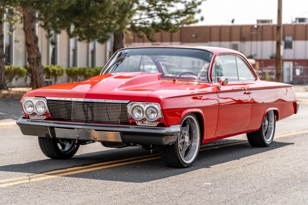 …This 1962 Chevrolet Impala sport coupe was refurbished and modified during prior ownership, which reportedly included refinishing the frame, repainting the bodywork in Torch Red, reupholstering the interior, and installation of a 496ci V8 paired to a Muncie four-speed manual transmission. Additional modifications include a ‘bubble top’-style greenhouse, an Edelbrock cross-ram intake, dual Holley carburetors, aluminum cylinder heads, a Comp Cams roller camshaft, tubular headers, an aluminum radiator, four-wheel disc brakes, lowered suspension, and 20″ wheels.