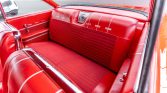 During prior ownership this example was modified with a Bel Air-style “Bubble Top” greenhouse, and the trim was removed and shaved before the body was refinished in Torch Red. Additional modifications include a cowl-induction hood scoop and bumpers refinished to match the wheels, and the windshield wipers have been removed.
