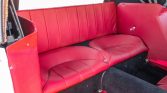 The cabin features low-back front bucket seats trimmed in red upholstery as well as a black dashboard pad and carpeting. BJ7 models featured dual rear seat bottoms with a shared backrest pad for a 2+2 configuration. Additional equipment includes red lap belts, black rubber floor mats, and an under-dashboard Realistic speaker. The interior door panels are not installed but are included in the sale along with roll-up windows and weather seals.