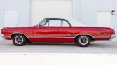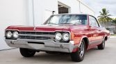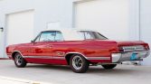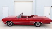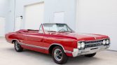 This 1965 Oldsmobile 442 convertible is powered by a 400ci V8 linked to a three-speed Turbo Hydra-Matic automatic transmission and is finished in red with a power-operated white soft top over red vinyl upholstery. Equipment includes Super Sport 15″ wheels, red-line tires, power steering, power-assisted drum brakes, dual exhaust, front bucket seats, and Sunpro auxiliary gauges. The vehicle was refurbished at some point prior to 2018. Subsequent service is said to have involved overhauling the brakes and replacing the voltage regulator, tires, points, fuel sending unit, windshield, and tailpipes.