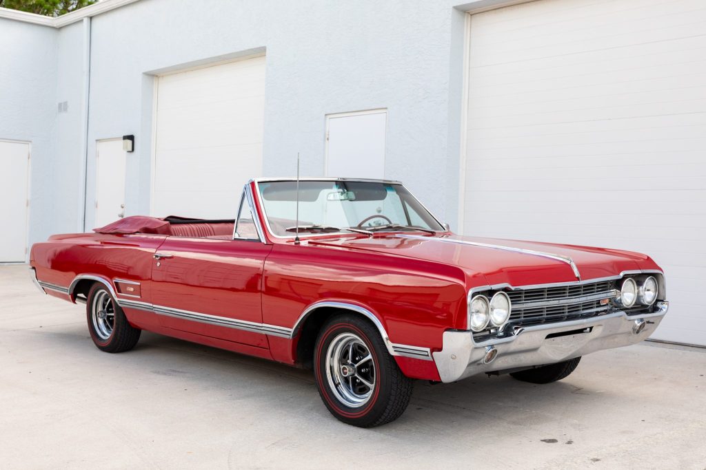 Oldsmobile produced 3,468 Cutlass convertibles with the 442 performance package for 1965. Finished from the factory in Target Red with a black convertible top (R-1), this car has been repainted in red and fitted with a power-operated white convertible top. Equipment includes a red top boot, quad headlights, chrome bumpers, bright trim, 442 badging, a driver-side mirror, and reverse lights. The windshield and windshield molding reportedly were replaced in 2022.