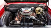 The cabin features front bucket seats and a rear bench that have been reupholstered in red vinyl and are accented by coordinating door panels and replacement red carpeting. Appointments include lap belts, patterned-metal dash trim, a heater, and a locking glovebox.