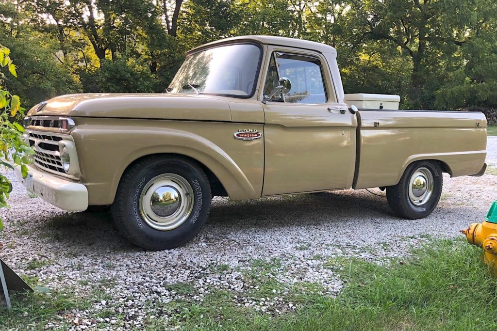 This 1966 Ford F-100 is a short-bed styleside pickup finished in bronze and is powered by a replacement 200ci Thriftpower inline-six paired with a three-speed automatic transmission. Equipment includes a woven bench seat cover, a steel storage box in the bed, a sliding rear window, Holley Sniper electronic fuel injection, an MSD electronic ignition system, Saginaw power steering, front disc brakes, and a suspension system said to lower the ride height by 3″. Refurbishment work under prior ownership is said to have included a repaint along with the installation of the replacement engine and transmission and overhauls of the brake and suspension systems.