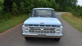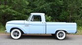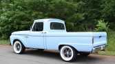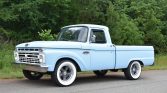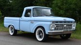 This 1966 Ford F-100 was acquired by the current owner in 2018 and subsequently fitted with a 351ci Windsor V8 paired with a TCI Stage 2 three-speed automatic transmission. The truck is finished in satin light blue over blue upholstery, and equipment includes 17″ American Racing wheels with Diamond Back Classics whitewall tires, Master Power four-wheel disc brakes, a FiTech fuel injection system, an Edelbrock intake manifold, a Champion aluminum radiator with dual electric fans, Sanderson headers, an MSD electronic ignition system, and three-point seat belts. Front and rear swaybars have been added and the shocks and fuel tank have been replaced.