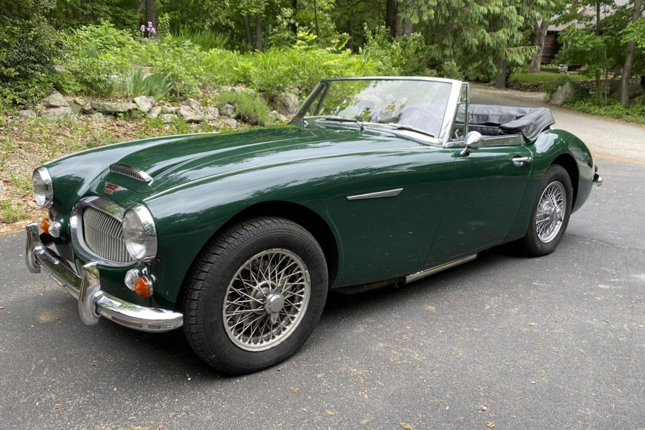 This 1967 Austin-Healey 3000 BJ8 Mk III is a 2+2 roadster that is finished in green over a black interior. Power is from a 2.9-liter inline-six mated to a four-speed manual transmission with overdrive, and additional equipment includes a black soft top, a luggage rack, and an aftermarket CD stereo. New rear wire wheels, front shocks, and rear axle splines were installed, the brakes were overhauled, and the clutch hydraulics were rebuilt in 2019.