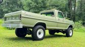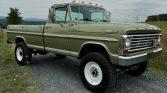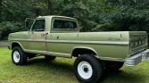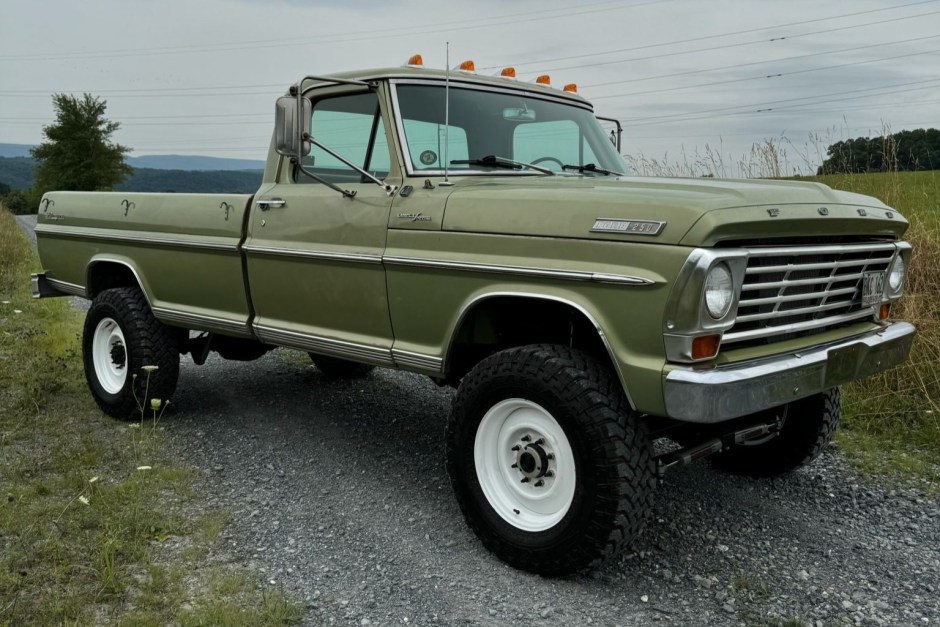 This 1967 Ford F-250 Ranger left the factory as a two-wheel drive Camper Special model equipped with a 352ci V8. Build carried out by Fairyland Automotive of Lehighton, Pennsylvania, involved disassembling the truck, refinishing the frame, rebuilding the three-speed automatic transmission, and installing a 360ci FE V8, a NP205 dual-range transfer case, and axles, brakes, and suspension components sourced from various late-model F-250s. The truck is finished in green and equipped with a Holley carburetor, Magnaflow mufflers, western-style side mirrors, clearance lights, Rough Country shocks, manually locking front hubs, and 17″ white-finished steel wheels as well as a cabin heater, an aftermarket stereo, and a bench seat upholstered in black vinyl.