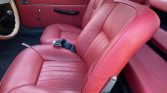 The cabin features front bucket seats and a rear bench that have been reupholstered in red leather with matching door panels and a contrasting black dashboard and carpeting. Equipment includes wood dash trim, a push-button AM/FM radio, a clock, and a glovebox. The floors are lined with rubber mats that were replaced in January 2017, and the crank for the left window was replaced in July 2020.