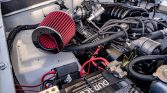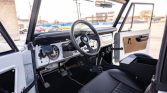 The 5.0-liter V8 was reportedly sourced from a 1980s Ford Thunderbird and rebuilt, and the seller notes that the cylinders have been bored oversize. Features include an aftermarket air intake, Bronco-script valve covers, an aluminum radiator with an electric fan, and tubular exhaust headers connected to a custom stainless steel exhaust system. Additional work completed during the refurbishment included replacing the engine accessories, wiring harness, battery and tie-down, and coolant overflow and washer bottles.