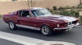 This 1968 Ford Mustang Fastback was modified in the style of a GT350 in the early 2000s and underwent a mechanical refreshment in 2018. Work included rebuilding the four-speed manual transmission, replacing the clutch assembly, flywheel, and steering column, performing electrical repairs, and installing a power-assisted rack and pinion steering gear along with Hotchkis suspension components. The car is finished in burgundy with white stripes over a black interior, and power is provided by a 302ci V8 that has been modified with an Edelbrock intake manifold, tubular headers, and a dual exhaust system with Flowmaster mufflers. Additional modifications include polished Torq Thrust wheels, ProCar bucket seats, a roll bar, and a Hurst shifter.