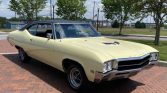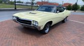 This 1969 Buick GS 400 coupe is finished in Cameo Cream with a black vinyl roof and is powered by a 400ci V8 paired with a three-speed automatic transmission. Equipment includes a Rochester Quadrajet carburetor, a center console, 14″ Rallye-style wheels, power steering, power-assisted drum brakes, black vinyl cabin upholstery, and auxiliary gauges. Work since 2020 included repainting the bodywork, re-chroming the bumpers, rebuilding the carburetor, and replacing the fuel tank, battery, and brake and suspension components.