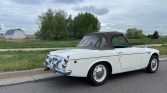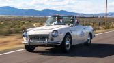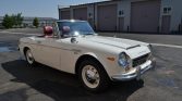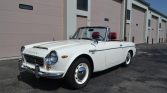 This 1969 Datsun 2000 roadster is finished in white over red vinyl and is powered by a 2.0-liter U20 inline-four linked to a five-speed manual transmission. Equipment includes dual carburetors, a Ron Davis radiator, and PerTronix ignition in addition to a removable black soft top, bright trim and bumpers, dual fender-mounted side mirrors, front disc brakes, and KYB shocks.