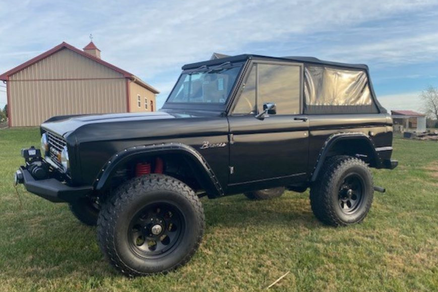 This 1969 Ford Bronco is finished in pearlescent black over gray cloth and is powered by a stroked 331ci Ford V8 paired with a Ford C4 three-speed automatic transmission and Dana 20 dual-range transfer case. The truck received a body-off refurbishment under previous ownership that included replacement of the frame and engine as well as a repaint. Equipment includes a removable Rampage black soft top, a Wild Horses 3.5” suspension lift kit, a Vintage Air air conditioning…
