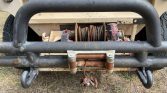 The 15″ steel wheels are mounted with older mismatched tires, and a spare is fitted to a swing-out carrier at the rear.