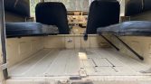 The interior features tan-painted steel surfaces, black vinyl low-back bucket seats, and inward-facing cargo-area jump seats. Equipment includes a glove compartment, front lap belts, a passenger-side grab handle, a heater, a CB radio, wind-up side windows, and a fold-down windshield.