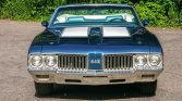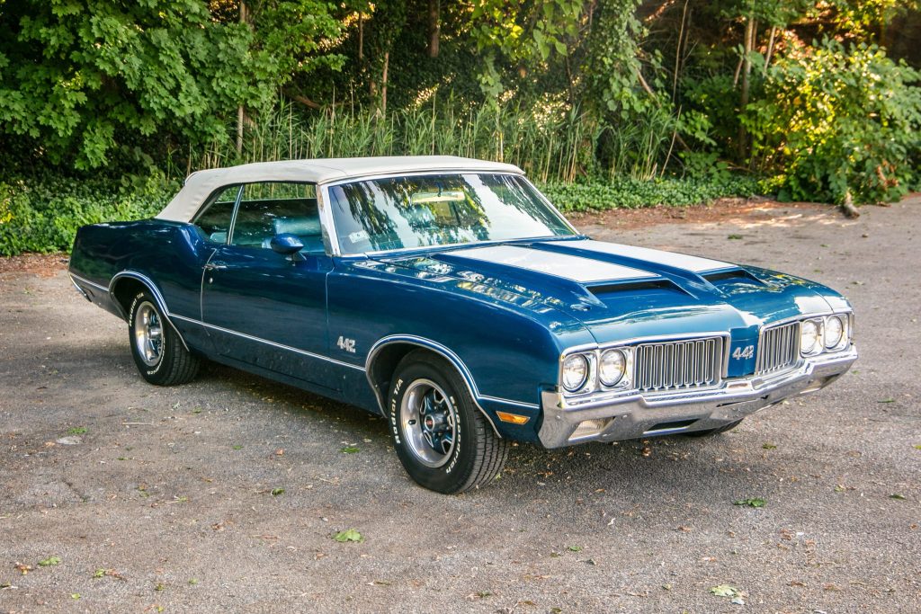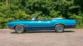 This 1970 Oldsmobile 442 convertible was initially delivered to Krouse Oldsmobile of Cherry Hill, New Jersey, and it is powered by a 455ci Rocket V8 that was overhauled in 2021. Power is routed through a three-speed automatic transmission and a heavy-duty performance rear axle with 3.23:1 gearing. Finished in blue with a power-operated white soft top and matching stripes, the car is equipped with ram-air induction, 14″ Super Stock III wheels, power steering, front disc brakes, and a…