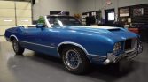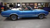 This 1971 Oldsmobile 442 convertible is finished in metallic blue with white stripes over blue upholstery and is powered by a replacement 455ci V8 paired with a three-speed TH400 automatic transmission. Additional equipment includes a power-operated white soft top, 14″ rally-style wheels, power-assisted front disc brakes, a ram-air hood, power-steering, air conditioning, a push-button radio, and an eight-track player. The seller acquired the car in November 2021, and subsequent work is said to have included reupholstering the…