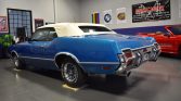 The car left the factory finished in Viking Blue (26) and is said to have been repainted during previous ownership. Features include a power-operated white soft top, a ram-air hood with white stripes and chrome twist locks, chrome bumpers with overriders, white side and decklid stripes, bright-finished trim, dual exhaust outlets, and “442” badging on the front grille, fenders, and decklid. Crazing is noted in the finish on the rear of the car, and additional work performed during current ownership is said to have included refinishing the driver-side rocker and reupholstering the soft top.