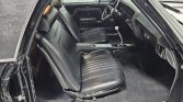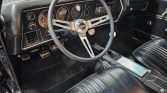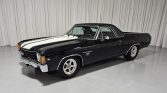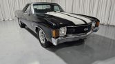 This 1972 Chevrolet El Camino is powered by a replacement 396ci V8 linked with a four-speed manual transmission, and it is finished in black with white rally stripes and a black vinyl roof cover. Equipment includes a cowl-induction hood, 15″ five-spoke wheels, Mickey Thompson tires, front disc brakes, and power steering, while the engine is fitted with an Edelbrock intake manifold, a Holley four-barrel carburetor, aluminum cylinder heads, long-tube headers, Flowmaster mufflers, and MSD ignition components. The cabin…