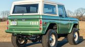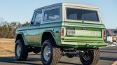 This 1973 Ford Bronco was refurbished and modified with the installation of a Roush-supercharged 5.0L Coyote V8 linked to a 10L80 ten-speed automatic transmission, a twin-stick transfer case, and locking front and rear differentials. The body was refinished in mint green pearl, and the truck rides on a lifted suspension in addition to 17″ steel wheels mounted with 35″ tires. Further equipment includes a removable hardtop, Mile Marker manually locking front hubs, power-assisted disc brakes, LED headlights, power-deployable side steps, and custom-fabricated front and rear bumpers. Inside, the front bucket seats are trimmed in saddle leather and are accompanied by Vintage Air Climate control, Dakota Digital instrumentation, a Flaming River steering column, and a custom audio system.