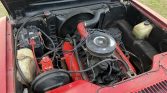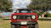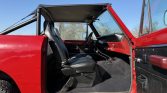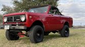 This 1973 International Harvester Scout II was refinished in red over black vinyl and is powered by a 304ci V8 linked to a four-speed manual transmission and a two-speed transfer case. Equipment includes a body lift, power steering, black 15″ steel wheels, a black bikini top, and a roll bar.