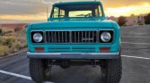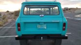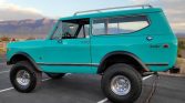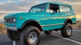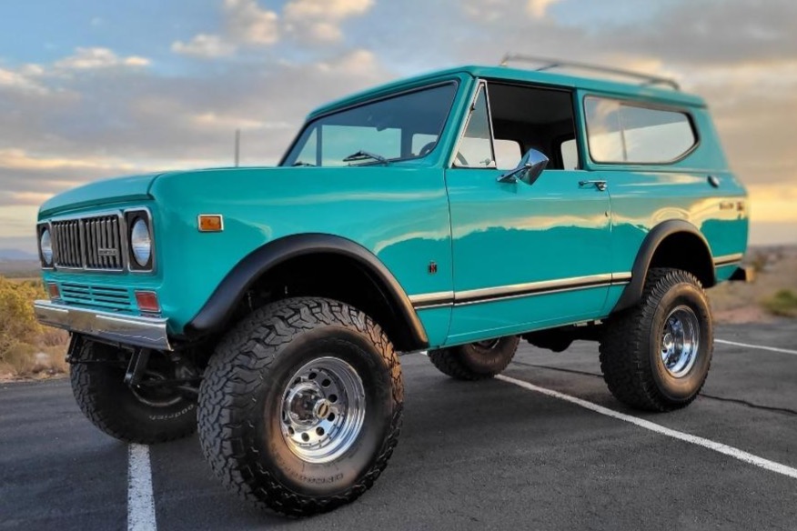 This 1973 International Harvester Scout II is finished in turquoise over a matching interior and powered by a 345ci V8 paired with a three-speed automatic transmission and a dual-range transfer case. Features include a suspension lift, 35″ tires, chrome wheels, manually locking front hubs, a removable hardtop, and a roof rack.