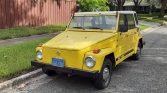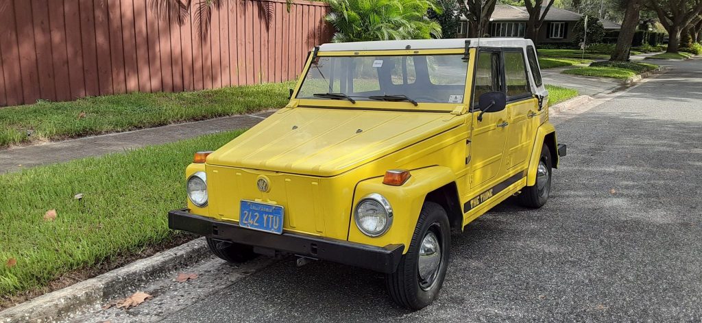 This 1973 Volkswagen Type 181 “Thing” was first registered in Oregon and has spent time in both California and Florida since the seller’s acquisition in September 1996. Finished in yellow over gray patterned cloth, it is powered by a 1.6-liter flat-four mated to a four-speed manual transaxle. Equipment includes a removable white hardtop, a fold-down windshield, removable doors, an AM/FM radio, an EMPI carburetor, and an aftermarket exhaust system. Services performed since late 2019 are said to include an oil change, a valve adjustment, and replacement of the fan belt, tires, and fuel system and ignition components.