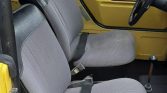 The seller believes that the bodywork was refinished in its factory Sunshine Yellow (L11E) during prior ownership. A removable white hardtop is fitted, along with dual mirrors, removable doors, and black bumpers. Imperfections in the bodywork are visible, and a tie-down vinyl bikini top is included in the sale.