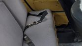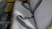 The front and rear seats are upholstered in gray patterned cloth and black vinyl, and equipment includes sun visors, lap belts, an AM/FM Roadmaster radio, and rubber floor mats.