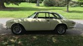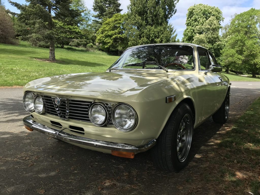 This 1974 Alfa Romeo GTV 2000 was acquired by the seller in May 1992 and has subsequently resided in Washington State. The car is finished in pale yellow over beige cloth, and it is powered by a 2.0L twin-cam inline-four paired with a five-speed manual transmission. Equipment includes chrome bumpers, 15″ Panasport-style wheels, woodgrain trim, and a wood-rimmed Personal steering wheel. Refurbishment work under current ownership has reportedly included rust repair, refreshing the interior, and installing polyurethane suspension bushings, Dynamat sound insulation, a Crane Cams ignition system, and replacement fuel-system components.