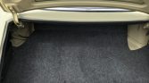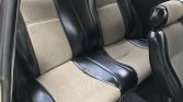 The cabin features seats trimmed in beige cloth with black bolsters. The dashboard and center console have woodgrain accents, and equipment includes a lockable glovebox, footwell storage compartments, and vent windows. Dynamat sound insulation has been installed, and the seller notes cuts in the headliner near the rear windows. A set of uninstalled rear-seat seatbelts is included in the sale.