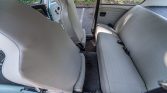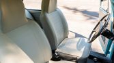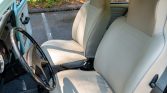 The cabin features front bucket seats and a rear bench seat trimmed in white along with matching door panels. Salt-and-pepper carpets line the footwells, and amenities include a heater, three-point front seat belts, and front vent windows.